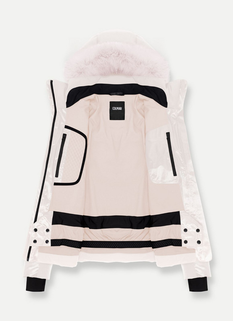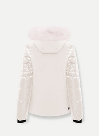 Ženska smučarska jakna z odstranljivo kapuco iz vodoodpornega (10.000 mm) in zračnega (10.000 g/m2/24h) laminiranega satena. Izmenjava gladkih in prešitih delov je združena z vstavki iz 92% recikliranega vodoodpornega (10.000 mm) in zračnega (10.000 g/m2/24h) raztegljivega softshella, ustvarjajoč prijetno igro globine in svetlobe, poudarjeno z različnimi višinami prešitega dela. Toplo in udobno oblačilo s kapuco in z krznom na robu za smučanje v najhladnejših dneh, brez žrtvovanja ženstvenosti. Uporaba recikliranega softshella in okolju prijazne vodoodporne obdelave Teflon EcoElite™ je del projekta Colmar Green Path, ki si prizadeva čim bolj spoštovati okolje.