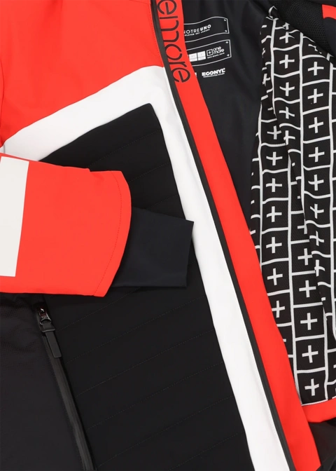 Smučarska jakna UNO TRE UNO je zasnovana za celodnevno smučanje, ne glede na vremenske razmere, in zagotavlja brezskrbno gorsko izkušnjo. Zunanji material, tehnična 4-smerno raztegljiva tkanina, je v celoti izdelan iz regenerirane preje ECONYL®. Jakna ima na sprednji in zadnji strani podlogo, ki jo obdaja grafični element v obliki puščice. V notranjosti pa je na hrbtni strani napis OneMore.