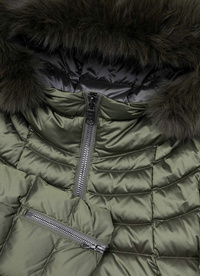 Women's hooded puffer jacket with fur for an elegant touch. Quilted and padded with feathers, it has two front pockets with a concealed zip, a zip fastening and a logo on the left sleeve.