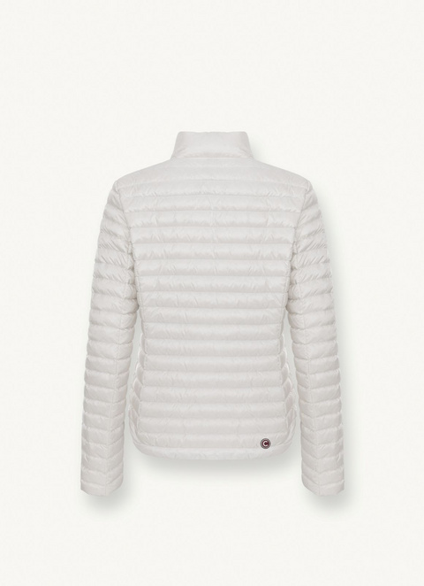 Women's jacket, padded in natural down, made of recycled fabric with iridescent effect and water-repellent treatment. The regular quilting on the upper part is lowered creating a diagonal motif on the waistline that underlines and emphasises the silhouette.