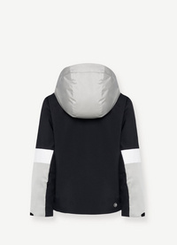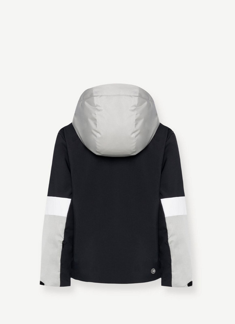 Girls’ jacket with removable hood in 100% recycled stretch polyester that’s waterproof (15,000 mm waterproof rating) and breathable (15,000 g/m2/24hrs). The waterproof satin finish fabric inserts create splendid plays of light. Padded with Ecosoft wadding, with 85% recycled fibres, which guarantees optimum thermal comfort.