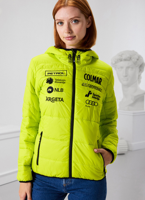 The lightweight ripstop quilted nylon women’s jacket is a replica of the garment that the Slovenian national ski team will wear for the FW22 season. The padding, in soft Thermore® Evodown® wadding, makes it ideal as a thermal garment to be worn on all outdoor winter occasions, or to be combined with a shell jacket as an intermediate layer. Embroideries and labels personalize the garment.