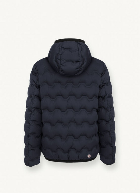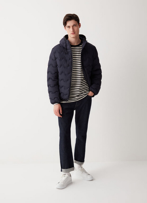 Men’s jacket with fixed hood made of soft stretch fabric with eco-friendly water-repellent Teflon EcoElite™ treatment. Natural feather padding. The special construction of the fabric, which does not need stitching for inserting the down, allows an unusual and bold change to the classic horizontal quilting to be created. The prominent elastic band with thin relief ribbing bordering the bottom and hood adds character to the garment.
