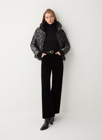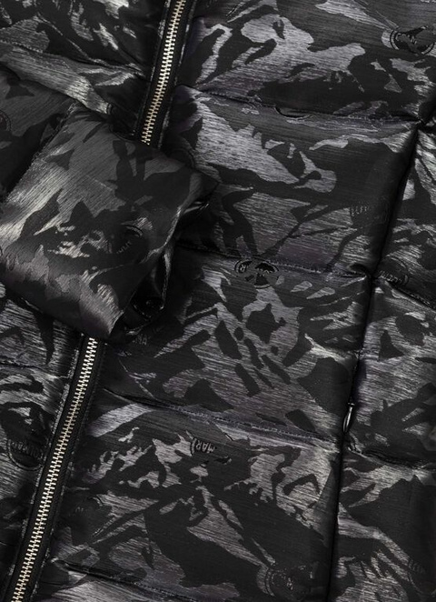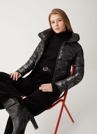 Women’s jacquard jacket with high collar, padded with natural down. Colmar DNA takes centre stage on this beautiful jacquard fabric model, made with shiny and opaque yarns that bring a 3D image to the mountain design, with a camouflage effect and brand logo. A garment representative Colmar’s two different souls: sport and glamour. The modern line and the fabric’s play on light make this model very feminine. Perfect in elegant situations, it brings a trendy touch to a casual outfit.