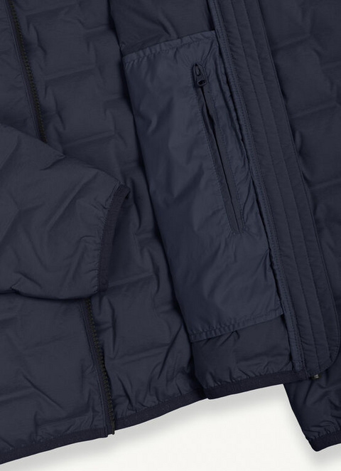 Men’s down jacket with fixed hood, made of soft and comfortable stretch microfibre. The double construction fabric allows the creation of channels where the down can be injected without the use of seams. A truly special garment to always stand out.