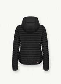Women's jacket with attached hood, made from ultra-lightweight water-repellent recycled fabric. Padded with light natural down. Convenient and practical side pockets, matching elastic edge on cuffs, bottom and hood and slightly fitted waist. These details make the garment feminine.