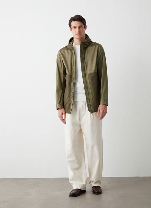 Men's medium-length jacket made from soft brushed cotton blend fleece with semi-glossy fabric inserts. The drawstrings at the hem, hood and waist allow you to adjust the fit.