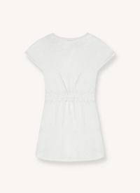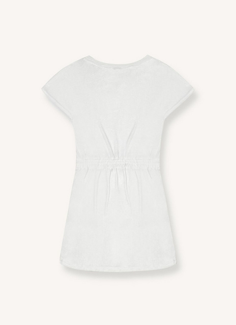 Women’s dress made of soft chenille with a semi-glossy appearance. This garment with a jaunty line, with dropped shoulders and short sleeves, is fresh and fun. A drawstring at the waistline adjusts the width, defining the silhouette. Comfortable and practical, it is perfect on cool summer days.