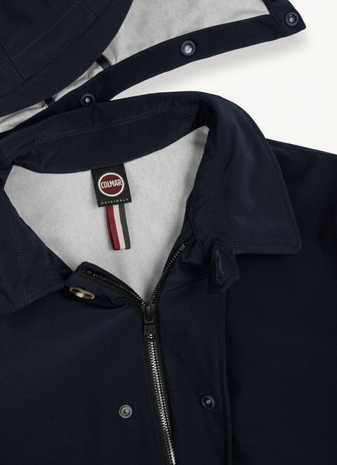 Men’s jacket in waterproof (5000mm/H2O) and breathable (5000gr/m2/24H) stretch softshell. Water-repellent treatment. Medium length model with detachable hood and drawstring to adjust the width. Comfortable and spacious side pockets and functional small inside pocket. The collar fastening is regulated by a toggle with a 4-hole button. Suitable for facing the spring season.