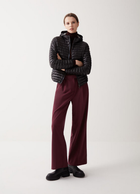 Women's jacket with fixed hood made of recycled fabric with iridescent effect and water repellent treatment. Natural feather padding. Sporty details such as regular quilts all over the body, the elasticated band in matching colour that borders the hood, bottom and cuffs, do not detract from the femininity, highlighted by the waist fit. Live the autumnal season with the style of the iconic 100 grams down jackets by Colmar Originals.