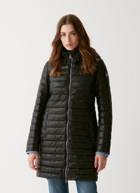 Women’s jacket with removable hood, mid-length, made of recycled fabric with iridescent effect and water-repellent treatment. Padded with light natural down. An essential garment, slightly fitted at the hips, with regular quilts. A medium weight, it is suitable for the autumnal season and perfect to complete your every look.
