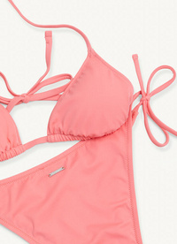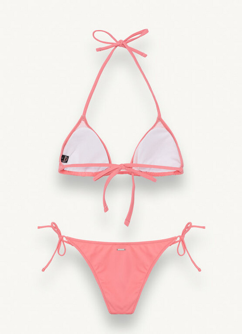 Women's bikini in stretch lycra with bright colour rendering. This evergreen model features a triangle top. The briefs with side laces are embellished with the plate bearing the company logo. A fresh and fun garment to spend days at the seaside or in the pool in a carefree way.