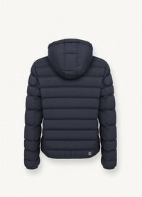Men’s jacket with detachable hood, made of stretch fabric with water repellent treatment and padded with natural down. An evergreen model with regular quilting all over the body and a matching colour elastic ribbon at the cuffs and hem. Comfortable side pockets and practical internal pocket. The drawstring on the hood allows you to adjust the width.