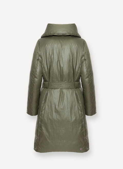 Women's long jacket made from soft, super-light, high-density, 100% recycled polyamide fabric with a marbled effect and an environmentally-friendly water-repellent and downproof treatment. Natural feather padding. This style is distinguished by the wide, enveloping collar and the quilted belt that ties on the waist to emphasise the silhouette. Functional and comfortable – a must-have for cold autumn days.