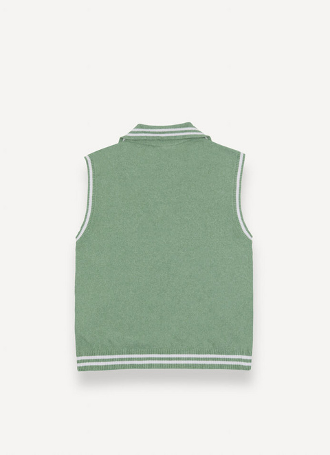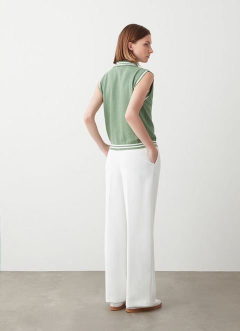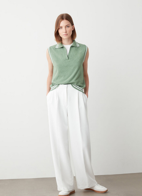 Women’s sleeveless polo shirt made from a soft and cool cotton blend terry-effect yarn. V-neck and narrow stripes in contrasting colour.