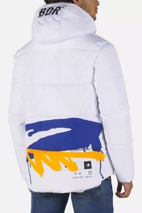 Cosy comfortable BOXEUR DES RUES in a white hi-tech fabric. This garment features a hood, front-zip fastening, zipped pockets with a rubber-coated pull tab and an elasticated drawstring hemline. This piece of outerwear has been completed with an embossed logo on the hood and a coloured graffiti-style print detail at the back.