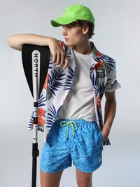 Make sure your wardrobe is holiday-ready with this men's short-sleeved shirt, made from soft cotton poplin with an all-over tropical leaf print. Styled with a classic bowling collar for a laid-back look, it features a button closure and rear yoke.