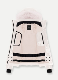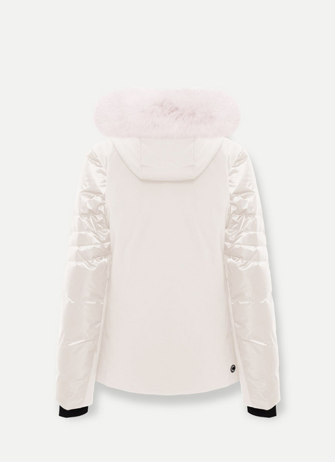 Women’s ski jacket with detachable hood in waterproof (10,000 mm) and breathable (10,000 gr/m2/24h) laminated satin. The alternation of smooth and quilted parts is mixed with inserts in 92% recycled waterproof (10,000 mm) and breathable (10,000 g/m2/24) stretch softshell, creating a pleasant play on different depths and brightness, underlined by the differing quilt heights. A warm and comfortable garment featuring a hood with real fur trim for skiing on the coldest days, without sacrificing femininity. The use of a recycled softshell and the eco-sustainable Teflon EcoElite™ water-repellent treatment are part of the Colmar Green Path project, aiming to respect the environment as much as possible.