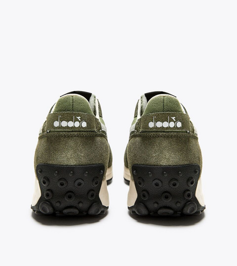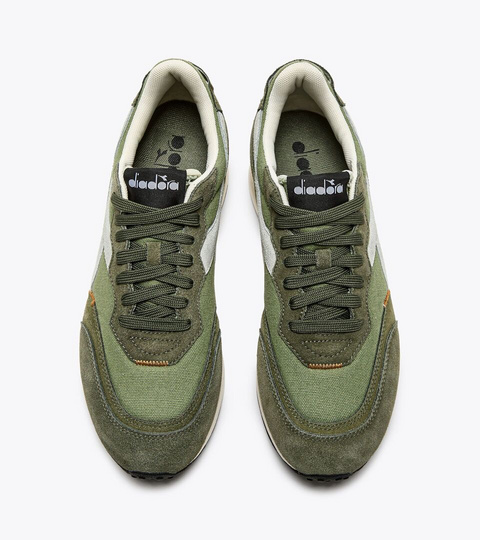 Race Suede SW, klasična tenisica za trčanje iz 80-ih, vraća se kako bi proslavila diadorino sportsko nasljeđe. Potplat vjerno ponavlja izvornu verziju, dok je gornjište obnovljeno u suvremeniji stil. Platno na četvrtini i vampu tretirano je voskom dajući šarmantan izlizan efekt.