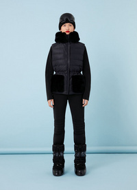 Ženski skijaški prsluk izrađen od laminirane vodonepropusne (6000 mm) i prozračne (8000 g/m2/24) polusjajne ripstop tkanine. Podstavljena mekim, ispranim i steriliziranim paperjem s vodoodbojnim tretmanom. Originalan i pravi štreber, ova majica bez rukava mijenja dijamantni uzorak s ostalim prugama. Neobični su veliki i topli džepovi od krzna pravog rex zeca i unutrašnjost kapuljače. Jedinstven detalj: odvojivi krzneni džepovi. Rastezljiva baza sadrži grafenska vlakna koja ravnomjerno raspoređuju toplinu po tijelu. Ekskluzivan odjevni predmet obogaćen svjetlucavim Colmar logom za nošenje samostalno ili preko nekog od kombinezona kolekcije u najhladnijim danima. Ekološki prihvatljiv Unidyne XF vodoodbojni tretman dio je projekta Colmar Green Path, čiji je cilj biti više ekološki prihvatljiv.