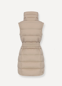 Ta elegantna ženska brezrokavna puhasta jakna srednje dolžine je izdelana iz mehke tkanine z mat videzom in vodoodbojno obdelavo, ki zagotavlja zaščito pred rahlim dežjem. Polnjena je z naravnim puhom, kar zagotavlja odlično toploto. Glavne značilnosti tega sodobnega in nevsakdanjega kosa so širok, ovitek vrat in elastičen pas, ki poudari pas. Vsestranska in udobna je idealna v kombinaciji z enim od puloverjev ali trenirk iz kolekcije.