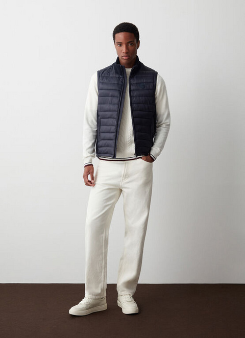 Muški prsluk izrađen od najlonske tkanine s vodoodbojnom obradom i djelomičnim podstavom s efektom perja. Savršen hibridni komad za prijelazna godišnja doba, kombinacija klasičnog prošivenog najlona s toplim vunenim pletivom sa strane i mekim pamučnim flisom za leđa. Neobičan i funkcionalan komad, idealan za prve jesenske dane.