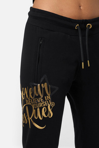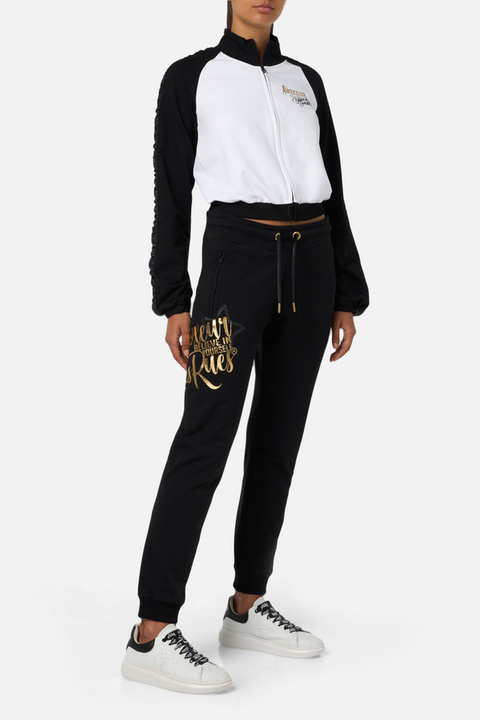 Duge hlače pravilnog kroja s elastičnim pojasom i velikim logom u zlatnoj foliji. Nepogrešiv stil za sofisticiranu i modernu ženu.