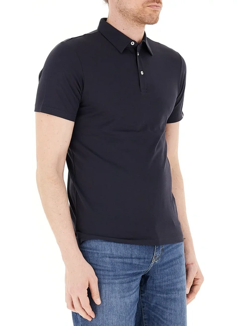Moška polo majica iz raztegljivega bombažnega piquéja s srajčnim ovratnikom. Ta zgornji del z diskretnim logotipom na rokavu odlikuje minimalističen, enobarven videz.