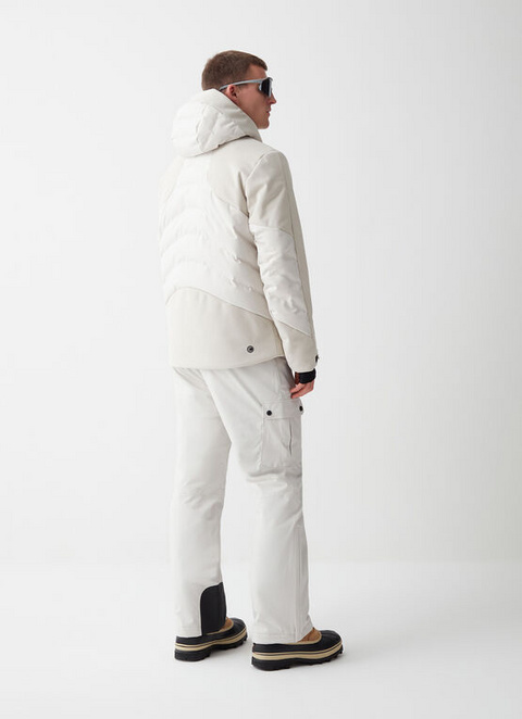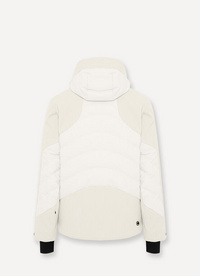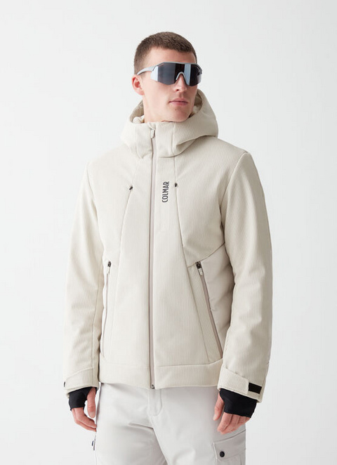 Muška skijaška jakna od rastezljivog baršuna, presvučena vodootpornom (vodootpornost 10.000 mm) i prozračnom (10.000 g/m2/24 sata) membranom. Kapuljača, stražnji dio i strane imaju prošivene umetke izrađene od glatke 100% reciklirane rastezljive tkanine. Baršunasti dio podstavljen je 93% recikliranim Clo® Univa Eco pamukom, dok su prošiveni dijelovi izrađeni od Microflock Re-Paddinga, nove vrste umjetnog paperja izrađenog od 100% recikliranog poliestera. Funkcionalan i tehnički, ovaj odjevni predmet nudi minimalistički i trendi izgled.