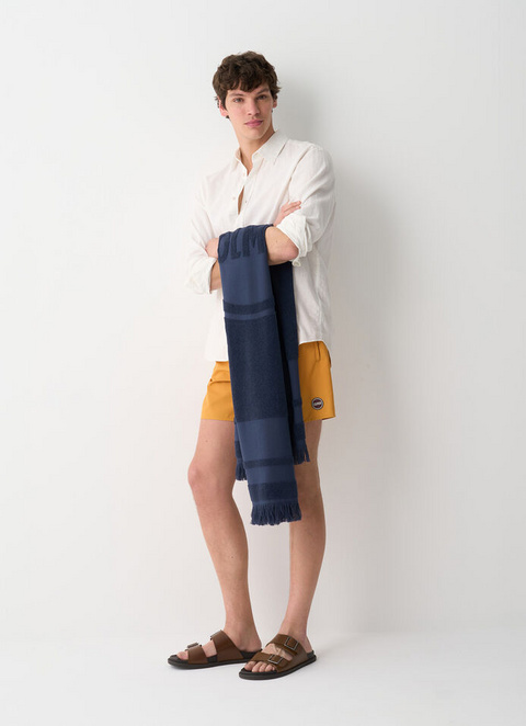 Brisača iz bombažnega frotirja z resicami na obeh koncih in všitim jacquard logotipom Colmar Originals. Popolna spremljevalka za na plažo ali ob bazen.