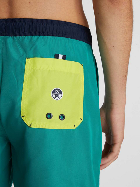 Izrađene od recikliranog poliestera sa svilenkasto mekom teksturom, ove kupaće hlače ističu prepoznatljivu estetiku stila života Sjevernog pola i nepokolebljivu predanost održivosti. Njihova odvažna grafika naglašena je kontrastnim naramenicama, raznobojnim vezicama i džepom s logotipom na leđima. Opremljene su gaćicama microworld koje jamče udobnost i slobodu kretanja.