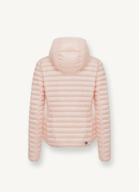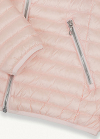 Ženska jakna s fiksnom kapuljačom, izrađena od vodoodbojne ultra lagane tkanine i podstavljena laganim prirodnim paperjem. Praktični i praktični bočni džepovi, usklađeni elastični rubovi na manžetama, donjem dijelu i kapuljači te lagano pripijeni remen. Ovi detalji čine odjevni predmet ženstvenim.