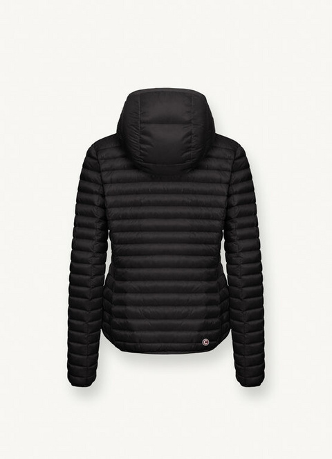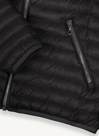 Ženska jakna s fiksnom kapuljačom, izrađena od vodoodbojne ultralake tkanine i podstavljena laganim prirodnim paperjem. Praktični bočni džepovi, odgovarajući elastični rubovi na manžetama, porubu i kapuljači te blago stegnuti struk. Ovi detalji čine odjevni predmet ženstvenim.