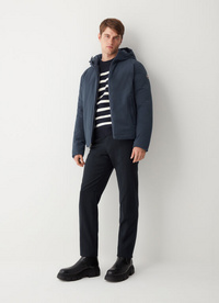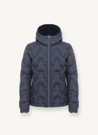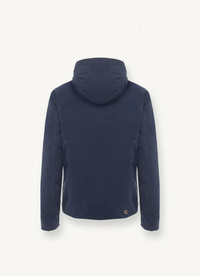 Muška jakna dvostrana s fiksnom kapuljačom izrađena s vanjske strane od rastezljive mat tkanine s vodoodbojnom i vodonepropusnom obradom (5000 mm vodenog stupca), a s unutarnje strane od tkanine neobične konstrukcije koja ne zahtijeva šivanje. Podstava od prirodnog perja. Tehničke karakteristike i strogost vanjštine dobro se stapaju s kreativnošću interijera kako bi se stvorila sportska odjeća glamuroznog izgleda. Udoban i praktičan, ima podesivu kapuljaču zahvaljujući uzici koja omogućuje podešavanje širine.