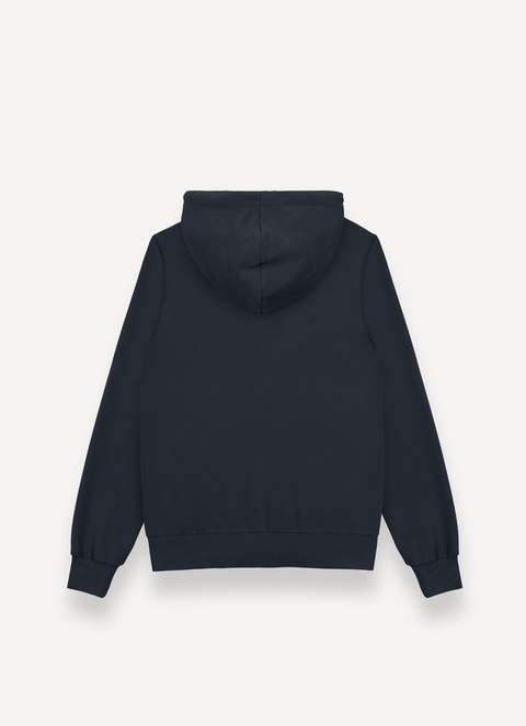 Moški pulover z okroglim izrezom, izdelan iz raztegljive bombažne mešanice z rebrasto Ottoman strukturo. Vsestranski in funkcionalen model s kapuco v videzu trikota se odlično poda tako k športnim kombinacijam kot tudi k urbanim stilom.