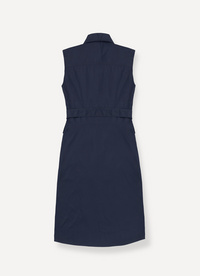 Elegant sleeveless dress with front button fastening, made from light cotton poplin. Two comfortable patch pockets on the sides with double entrance and matching belt to cinch the waist.