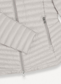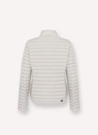 Ženska jakna oprijetega kroja iz izjemno lahke tkanine, izdelane iz 100 % recikliranih materialov, z vodoodbojno obdelavo. Športen kos z ženstvenim videzom, ki ga poudarja rahlo oprijet pas. Igrivo prešivanje prispeva k glamuroznemu videzu jakne. Vsestranski in funkcionalen model, popoln za prve pomladne dni.