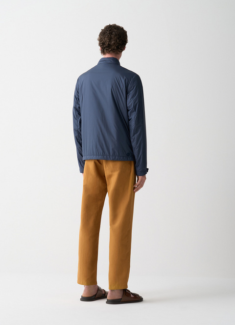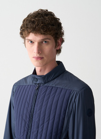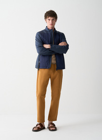 Men's biker jacket with ultrasonic stitching, a striped pattern on the front, and light padding. Perfect for a practical and functional look. The pocket features a removable carabiner with a personalized lanyard that can be used as a keychain.