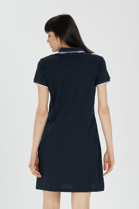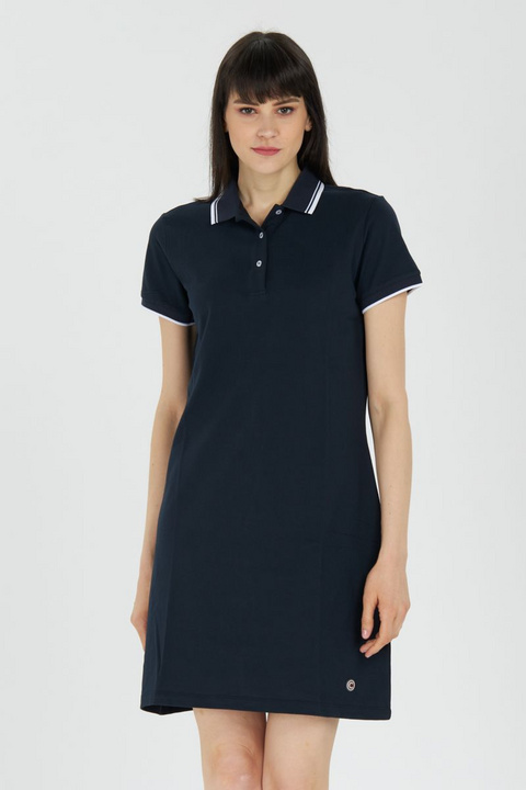 Polo haljina s rastezljivom pamučnom točkom. S kontrastnim detaljima na vratu i rukavima, savršen je model za one koji vole udobnost polo majice bez žrtvovanja ženstvenosti.