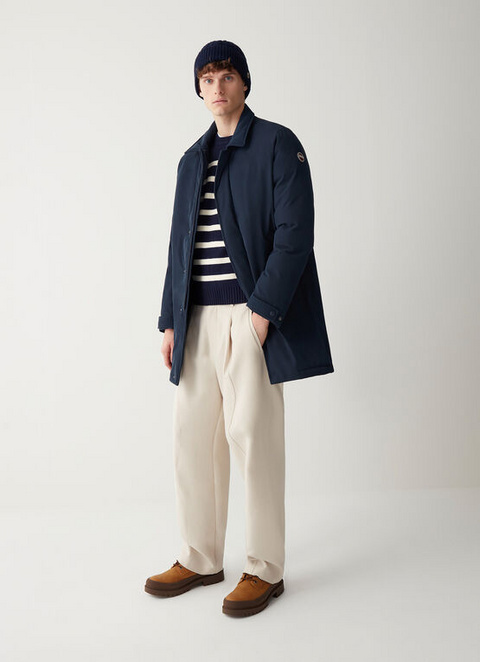 Men’s down jacket made from soft wool-effect polyester gabardine with a laminated back that guarantees 5,000 mm water column performance. Water repellent treatment and natural down padding. A re-visitation of the classic coat, made more sporty by the toggles that adjust the fastening on the neck and sleeves, allowing greater protection from the cold.