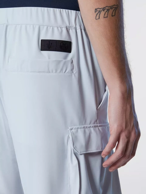Te kratke hlače cargo, ki so nastale iz ekskluzivnega sodelovanja med obema blagovnima znamkama, so izdelane iz štirismerno raztegljivega blaga, ki vsebuje recikliran poliamid, posebej zasnovano za vrhunsko udobje in zračnost. Označen z Maseratijevim ikoničnim trizobom na zavihku levega žepa in našitkom z logotipom Collab nad zadnjim žepom za značilen pridih.