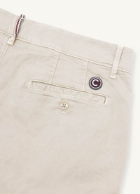 Moške kratke hlače iz lahkega bombažnega sukna. Robovi na žepih in notranji tribarvni trak dajejo temu klasičnemu in elegantnemu oblačilu par excellence športni pridih. Enostaven model, ki ga lahko kombinirate z vsemi oblačili.