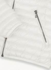 Ženska jakna s fiksno kapuco, izdelana iz vodoodbojne ultralahke tkanine in podložena z lahkim naravnim puhom. Priročni in praktični stranski žepi, ujemajoči se elastični robovi na manšetah, spodnjem delu in kapuci ter rahlo oprijet pas. Ti detajli naredijo oblačilo ženstveno.