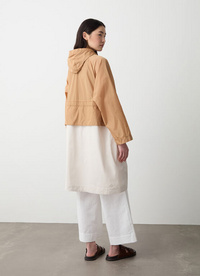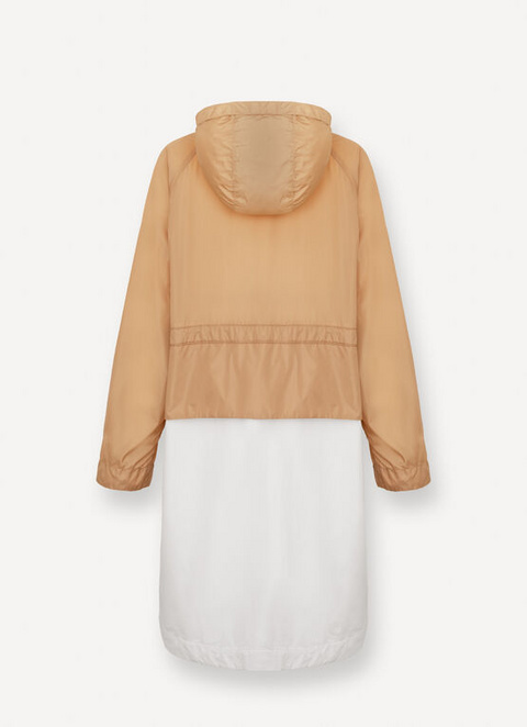 Ženska jakna s snemljivo kapuco, izdelana iz mehkega bombažnega gabardina z vodoodbojno obdelavo in vložki iz lahkega najlona v kontrastni barvi. Oversize kroj z nastavljivim pasom na vrvico in zlatimi detajli za ženstven in moderen videz.