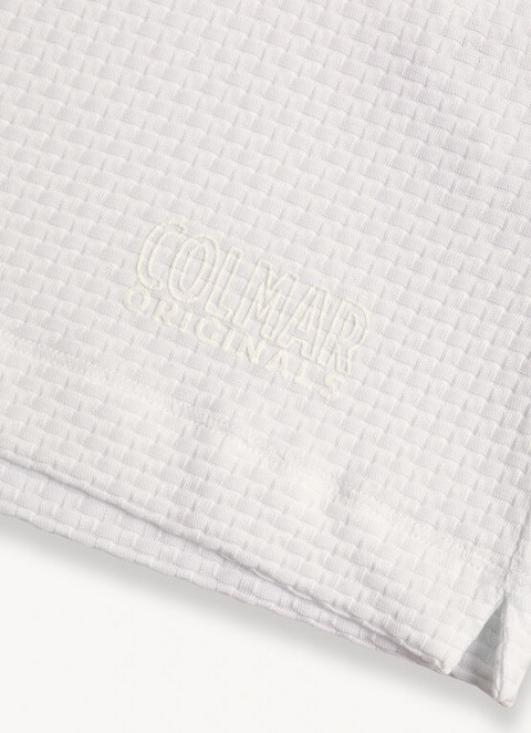 Ženska majica s kratkimi rokavi iz žakard rebrastega pletenja. Prefinjena igra tkanja, ki prihaja s tem posebnim dizajnom, doda ekskluziven pridih polo majici brez gumbov. Prepletanje osnovne tkanine in stranskih razporkov naredi to oblačilo z v tonu natisnjenim logotipom Colmar Originals še bolj očarljivo.