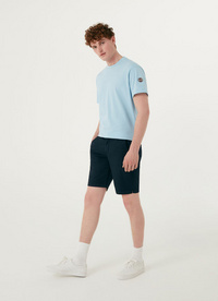 Moške bermuda hlače iz mehkega in hladnega bombažnega sukna. Robovi na žepih in notranji trak v tribarvni barvi dajejo oblačilu športni pridih. Enostaven model, ki ga lahko kombinirate z vsemi videzi.