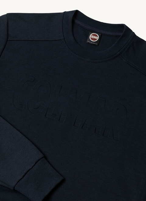Moški pulover z okroglim izrezom iz mehkega interlock blaga iz mešanice bombaža. Maxi logotip na prsih, barvno usklajen, izdelan s posebno tehniko pritiskanja, ki daje reliefni/odstranjeni učinek. Rebrasta pletenina na bokih naredi oblačilo udobnejše.