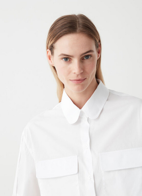 Majica s kratkimi rokavi v modernem safari videzu in udobnim krojem, izdelana iz lahkega bombažnega popelina. Odlikujeta jo dva velika našita žepa na sprednji strani in ženski ovratnik z zaobljenimi konicami.