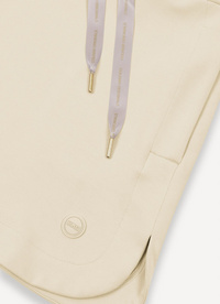 Mini krilo s stranskimi razporki in zaobljenim robom, izdelano iz svilnato mehkega bombaža/modal tkanine. Ženstvena vrvica s svilnatim učinkom in zlatim logotipom omogoča prilagajanje prileganja. Praktični žepi in mini logotip v enobarvnem silikonu.