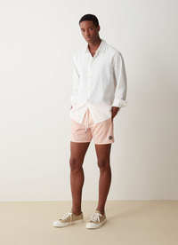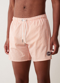 Moške kopalne kratke hlače iz hitro sušečega mehkega reliefnega poliestrskega blaga. Ta model je bil ustvarjen iz valovitega materiala z učinkom sesanja, potiskanega s paličastim vzorcem v svetlih barvah. To sveže in trendovsko oblačilo, ki ga lahko nosite s srajco in ustvarite popoln slog Azurne obale, je idealen spremljevalec za vaše poletne dni.